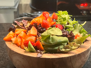 Mix de Lechugas fresa, arándanos, queso de cabra, nuez caramelizada y aderezo especial de miel de abeja.